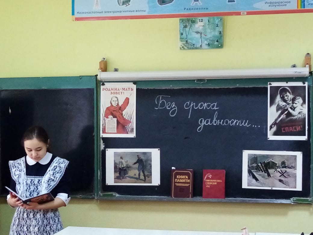 19 апреля 2022 года в школе прошёл День единых действий в память о геноциде советского народа нацистами и их пособниками в годы Великой Отечественной войны. Цель данного мероприятия – сохранение исторической правды о преступлениях нацистов и их пособников в отношении мирных советских граждан в годы Великой Отечественной войны на оккупированной территории. Показать через эту призму исторической памяти, что действия Красной Армии и единение советского народа в достижении Победы спасли наше государство и его граждан от полного уничтожения. Участниками Дня единых действий стали обучающиеся школы в возрасте от 12+ (7-9 классы) и 14+ (9-11 классы). Был проведён урок-реконструкция «Без срока давности», посвящённый памяти жертв геноцида Советского народа от немецко-фашистских захватчиков в годы Великой Отечественной войны 1941-1945 гг. для двух возрастных категорий. Основная идея реконструкции: обучающиеся погружаются в ситуацию выбора участника событий, связанных с геноцидом народов СССР нацистами и их пособниками в годы ВОВ, после чего получают информацию о реальных фактах геноцида на конкретных примерах. А также размещение поста «Нельзя забыть» в социальных сетях – послания сверстникам, в котором выражается личное восприятие и позиции обучающихся о преступлениях нацистов в отношении мирного советского населения.«Четыре года невыносимых народных страданий, мучений, голода и разрухи! Но наша страна выстояла. Не сломилась. Я призываю вас бороться за справедливость, пусть будет светлым будущее», –пишет в письме в будущее «Нельзя забыть» ученица 10 класса Ахматгалина Аида