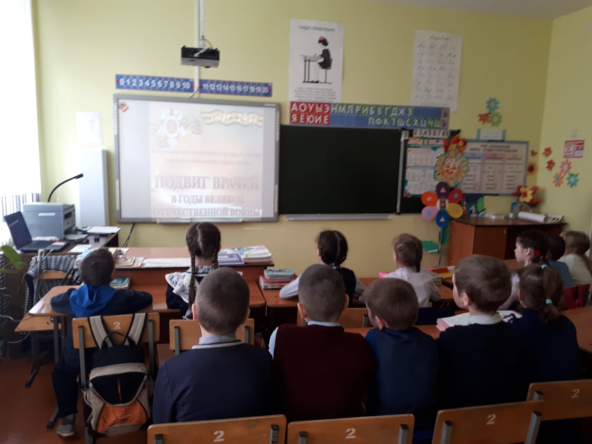 25 апреля 2022 года с обучающимися 1-4 классов был проведён урок «О военных врачах». Учитель Валиева А.Х. . рассказала о профессии военного врача, какими качествами должен обладать человек данной профессии. Обучающиеся читали заметки военных врачей. Из записей они узнали, что под пулями, разрядами снарядов, рискуя своей жизнью, но спасая других людей, военные врачи выносят с поля боя раненых и оказывают необходимую помощь. Тема уроков способствовала воспитанию уважения к профессии «военный врач», понимания важности прийти в трудную минуту на помощь человеку, которому она нужна.На мероприятии говорили в большей степени о сестрах милосердия, санитарках, которые выносили на себе с поля боя раненых солдат в Великую Отечественную войну. В годы войны самоотверженно спасали, возвращали солдат в строй свыше 200 тысяч врачей, полмиллиона фельдшеров, санитарок, санинструкторов. У каждого из них была своя война, смертельная опасность и тяжкий труд вместе. Ребята прослушали стихотворения и песни о тех, кто под пулями и разрывами снарядов, ежедневно рискуя собой, а часто и прикрывая своим телом, некрепкими девичьими руками выносил с поля боя раненых.