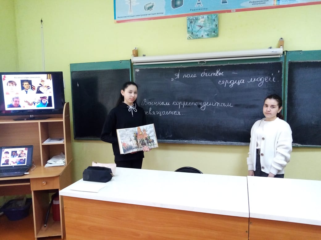В целях формирования у учащихся активной жизненной позиции, понимания роли военных корреспондентов на пути к победе в Великой Отечественной войне, осознание героического настоящего современных героев – российских журналистов и военных корреспондентов, в МОБУ СОШ д.Уразаево 13 мая был проведен Всероссийский Урок Памяти «А поле битвы-сердца людей», подготовленный учителем истории Шайхлисламовой С.Р.