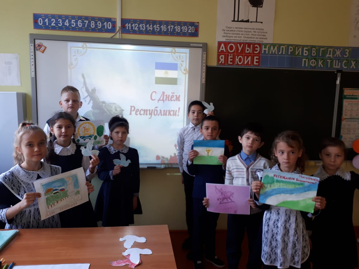 11 октября Башкортостан празднует День Республики. В преддверии этого события, а также с целью формирования у обучающихся целостного представления о родном крае, воспитания познавательного интереса, любви к своей малой Родине, в школе состоялась торжественная линейка «Башкортостан - мой край родной», а также были организованы викторины «Люби и знай свой край родной», «Яркие страницы истории становления Республики Башкортостан», в которой приняли участие любознательные девочки и мальчики. Классными руководителями на тематических классных часах проведены беседы с ребятами на тему: «Ими гордится Республика» «Мой выбор- моя малая родина»,«Тебя я славлю, мой Башкортостан», «Символы Республики». На уроках дети выразительно читали стихотворения башкирских поэтов о Башкортостане, пели песню на башкирском языке. Также они знакомили с историей провозглашения Декларации, с Государственными символиками РБ. Они узнали много интересного и нового о нашей республике. Библиотекарь школы Салимгареев Н.А. организовал выставку книг «Мой край – Башкортостан»