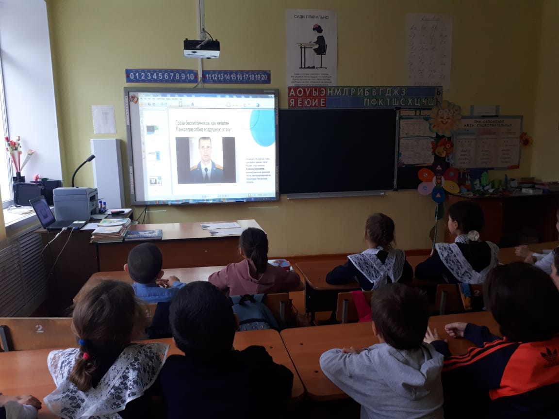 Профессия защитника правопорядка традиционно является одной из самых опасных в современном обществе. Находясь на переднем крае борьбы с преступностью и терроризмом, сотрудники полиции ежедневно подвергают свою жизнь огромному риску. К сожалению, не обходится без боевых потерь.ь огромному риску. И иногда так случается, что не обходится без боевых потерь. Сегодня советник директора по воспитанию провела Урок мужества "Герои нашего времени".Урок мужества построен на примере подвига Героя России Алексея Панкратова – командира зенитного ракетного дивизиона, уроженца Оренбургской области, выпускника Военной академии войсковой противовоздушной обороны имени Маршала Советского Союза А. М. Василевского в Смоленске, военнослужащего одной из частей,стоящих в Пензенской области. Ребята говорили о таких понятиях как: мужество, героизм, подвиг, доблесть, честь. Задавали себе вопросы: «Должен ли человек воспитывать в себе мужество?, В каких случаях это необходимо?» и отвечали на них каждый по-своему, но смысл один – «Мужество воспитывать в себе необходимо для того, чтобы в любую минуту встать на защиту своих близких, родных, друзей, россиян, своей Родины». Обсуждали эпиграф "Героями не рождаются, героями становятся"