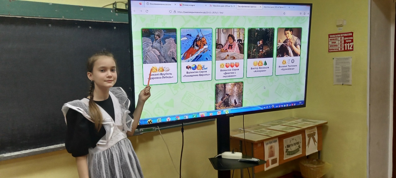 В этот день состоялся очередной урок из цикла «Разговоры о важном». Он приурочен к 170-летию Государственной Третьяковской галереи и посвящен музейному делу. Сегодня ребятам представилась возможность заочно посетить самый главный музей страны, погрузиться в материал выставочных залов, узнать, картины каких художников хранятся в Третьяковской галерее. В рамках занятия ребята посмотрели и обсудили фильм «Музейное дело», направленный на популяризацию историко культурного наследия и вовлечение детей и молодежи в музейную деятельность. Поговорили о том, зачем создаются музеи, как они сохраняют культурную память страны, и почему труд музейных работников помогает связывать прошлое, настоящее и будущее, выполнили интерактивное задание «Зашифрованные картины».